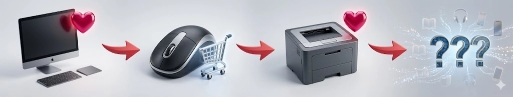 위 그림을 예시로 들어보겠습니다. 어떤 사용자에 대한 최근 행동 이력이 “Desktop 좋아요 → 마우스 장바구니 → 프린터 좋아요” 순서로 이어졌다고 가정하겠습니다. 이 사용자는 IT 기기들에 관심을 보이고 있네요. 그러면 이 사용자는 가까운 미래에 어떤 상품을 구매하게 될까요?
