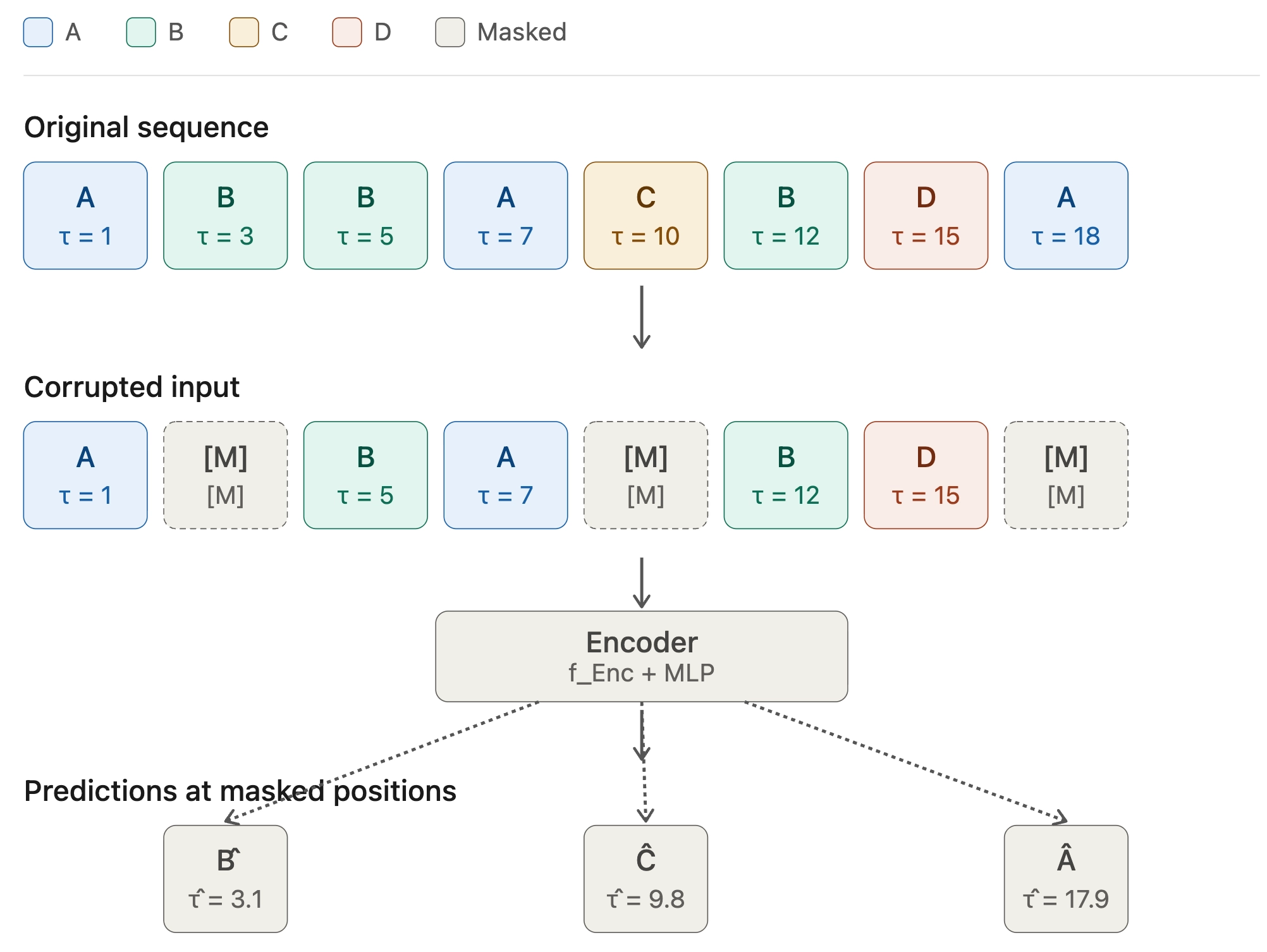 Masked Sequence Modeling은 행동 시퀀스에 일부 행동 정보를 마스킹하여 모델에 입력함으로써 시퀀스를 인코딩합니다. 이후 모델은 “마스킹한 위치의 이벤트가 어떤 이벤트였을지”와 “마스킹한 위치의 타임스탬프 값”을 각각 예측합니다.