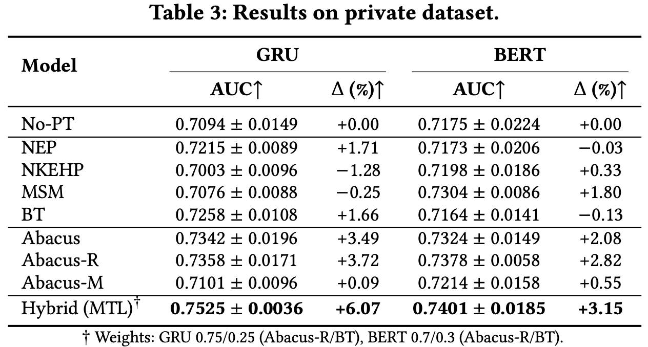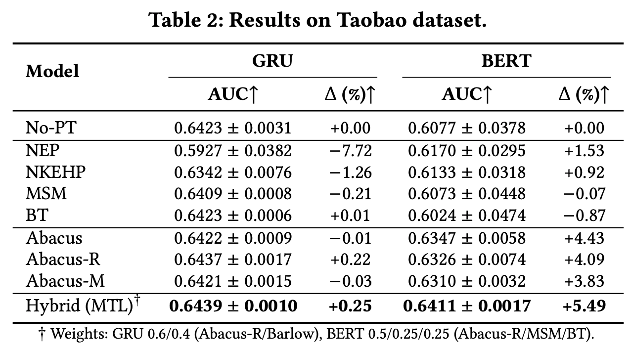 GRU 모델에 대해 Abacus-R과 Barlow Twins를 함께 학습하는 Hybrid 방식이 단일 방식 대비 최고 성능을 기록했습니다. BERT에 대해서는 Abacus-R + Masked Sequence Modeling + Barlow Twins 모두를 함께 활용하는 방식이 가장 우수한 성능을 보였습니다.