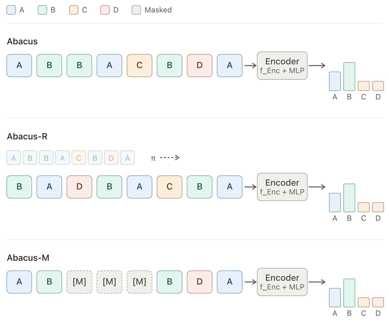 Abacus-M(asking)은 시퀀스의 일부 아이템을 마스킹한 시퀀스로부터 빈도수를 예측하도록 합니다. 이를 통해 일부 이벤트에 대한 정보가 없을 때에도 강건한 예측을 목표로 합니다.