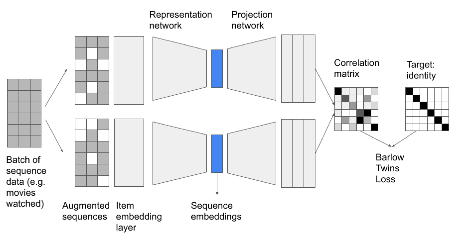 Enhancing User Sequence Modeling through Barlow Twins-based Self-Supervised Learning 논문에서 포함된 Barlow Twins 학습 방법